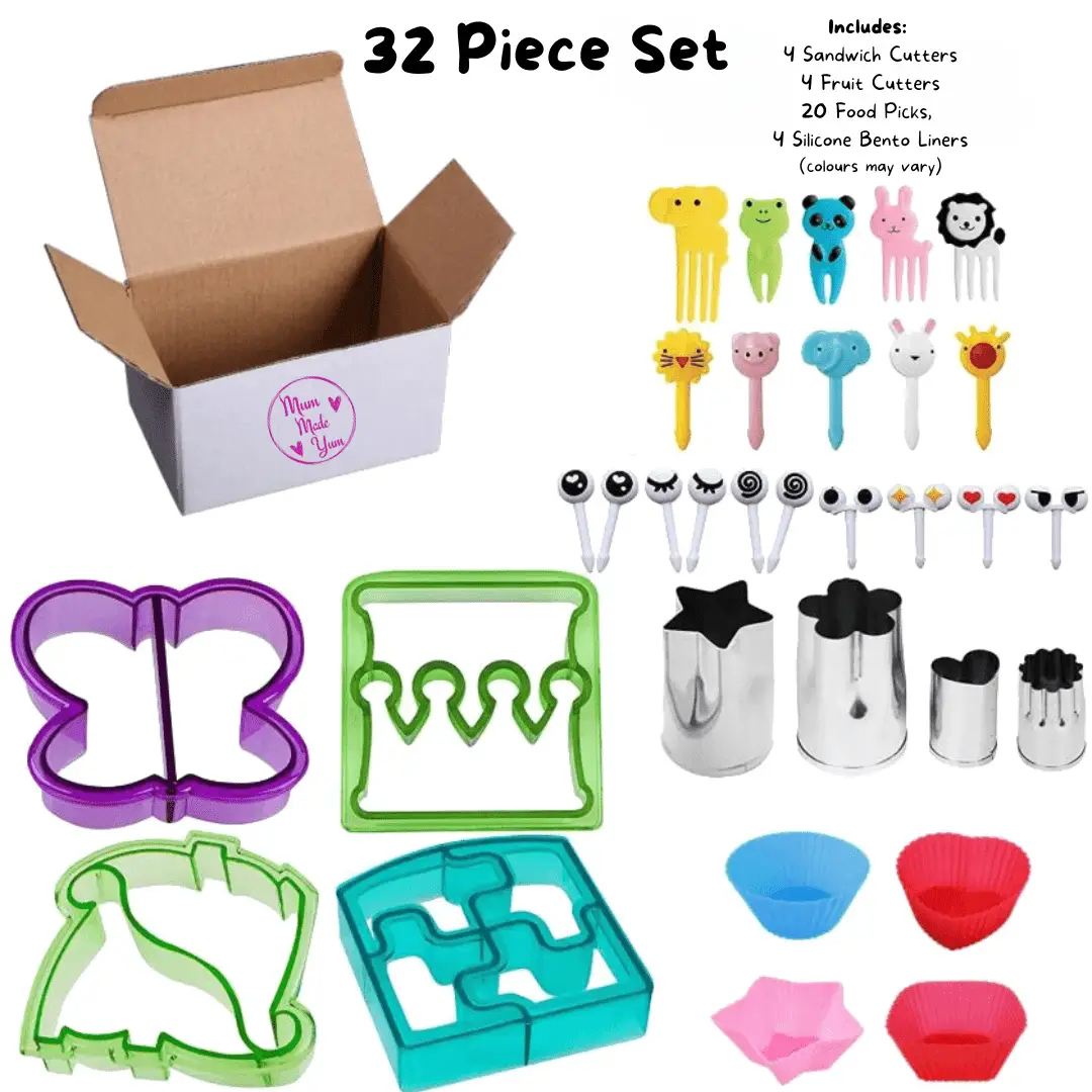 Beskrivelse Stor startpakke med utstikkere og pyntepinner for den ultimate matpakken med hele 32 deler - fra Mum Made Yum Her får du morsomme utstikkere, søte dyr og gøyale øyne i tillegg til silikonformer som kan brukes for å dele opp rom i matboksen. Hver boks inneholder: * 4 x utstikkere for brødskiver * 4 x frukt og grønnsaksutstikkere * 20 x pyntepinner * 4 x silikon former Farge og form kan variere |