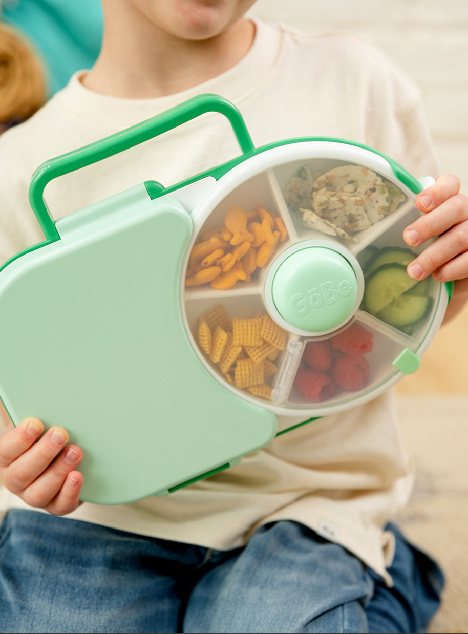 Beskrivelse Den HELT NYE GoBe matboksen er designet for maksimal moro med snacks! Den unike designen, komplett med bærehåndtak, bento-rom og Snack Spinner-kombo, holder alt sammen i en praktisk pakke. Trykk på knappen på spinneren for å åpne et nytt rom! Kjempegøy! Det er den perfekte matboksen for barn som spiser lunsj uansett hvor de travle hverdagene tar dem. Det lufttette rommet holder maten fersk, og de fem rommene i Snack Spinner appellerer til øyeblikkets snacksstemning. Pakk alle de gode tingene for variasjon og bekvemmelighet. |